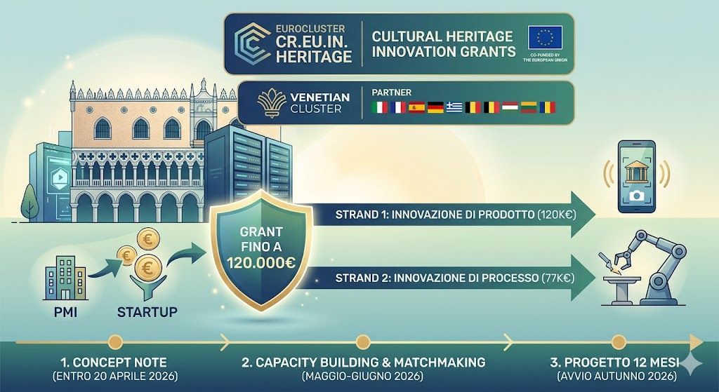 Il progetto europeo CR.EU.IN. HERITAGE (Eurocluster per la catena del valore del patrimonio culturale) ha ufficialmente aperto la sua "Call for Proposals". L'iniziativa mira a sostenere le PMI europee nella doppia transizione verde e digitale, riducendo la dipendenza da tecnologie extra-UE e rafforzando l'autonomia strategica del settore.
